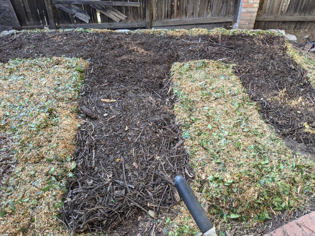 Turns out I totally cowboyed this whole thing. I guess you’re supposed to put the mulch on top of the compost? Or pull the compost away from the ground and plant directly into the soil? My soil that’s hard as concrete? I dunno. Here’s what I do know. I spent zero money on this and can rake it right back up into a heap if it sucks.
