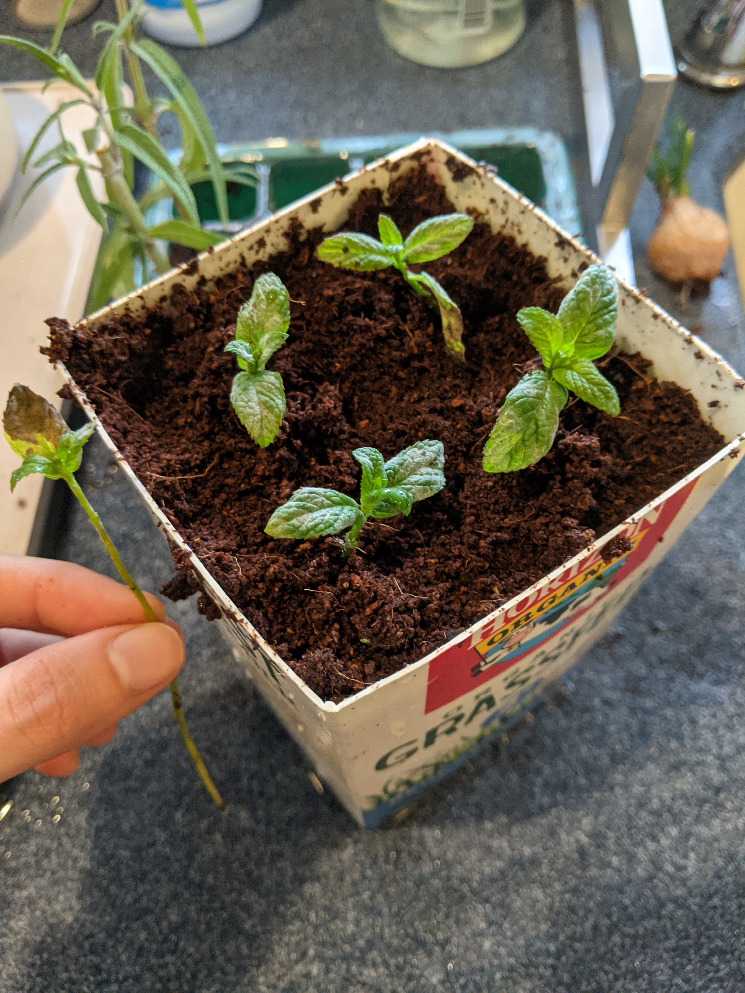 So today, I made a deep cuttings planter from a milk carton, and pulled my mint stems out of my leaf tray. Only one of the five stems had grown any roots at all, so I don’t feel like I’m losing much if this doesn’t work out.