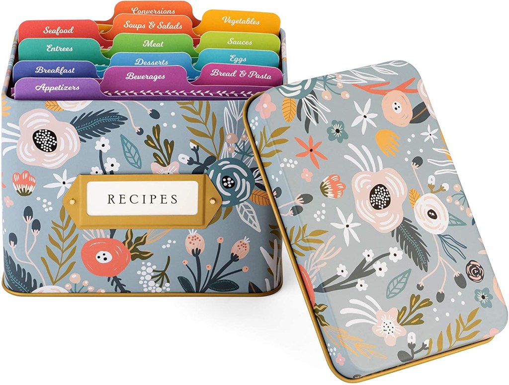 I love this recipe tin for the adorable factor. The outside could be labeled seeds, and the file cards inside re-labeled to sort the seeds. But today it costs nearly thirty bucks, and I’m not exited about spending that money on such a small box. My three Burpee pea seed packets stack to about one inch high, and this thing is only four and a quarter inches deep.