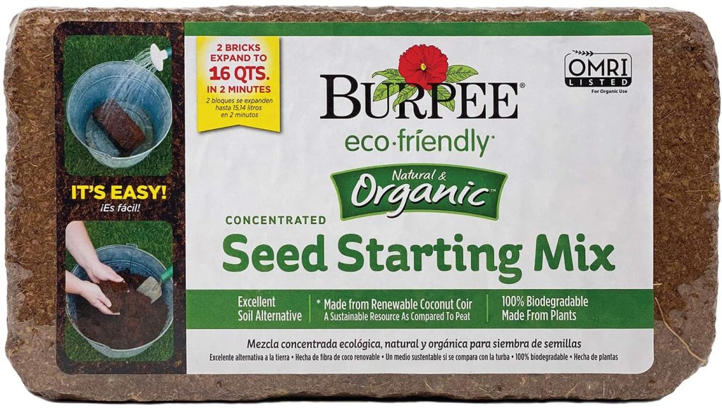 For my seeding mix, I’m using Burpee Organic Coconut Coir Concentrated Seed Starting Mix. This mix is great because it arrives condensed, rehydrates very easily, and supports seed growth really nicely. Plus it’s renewable resource.