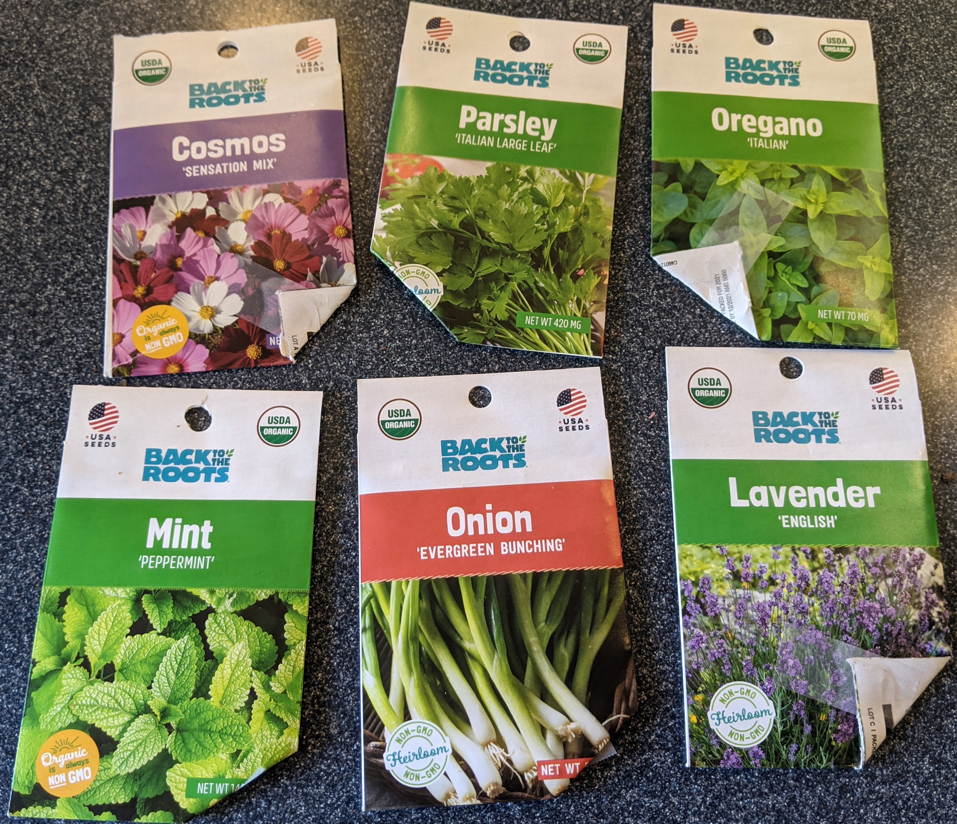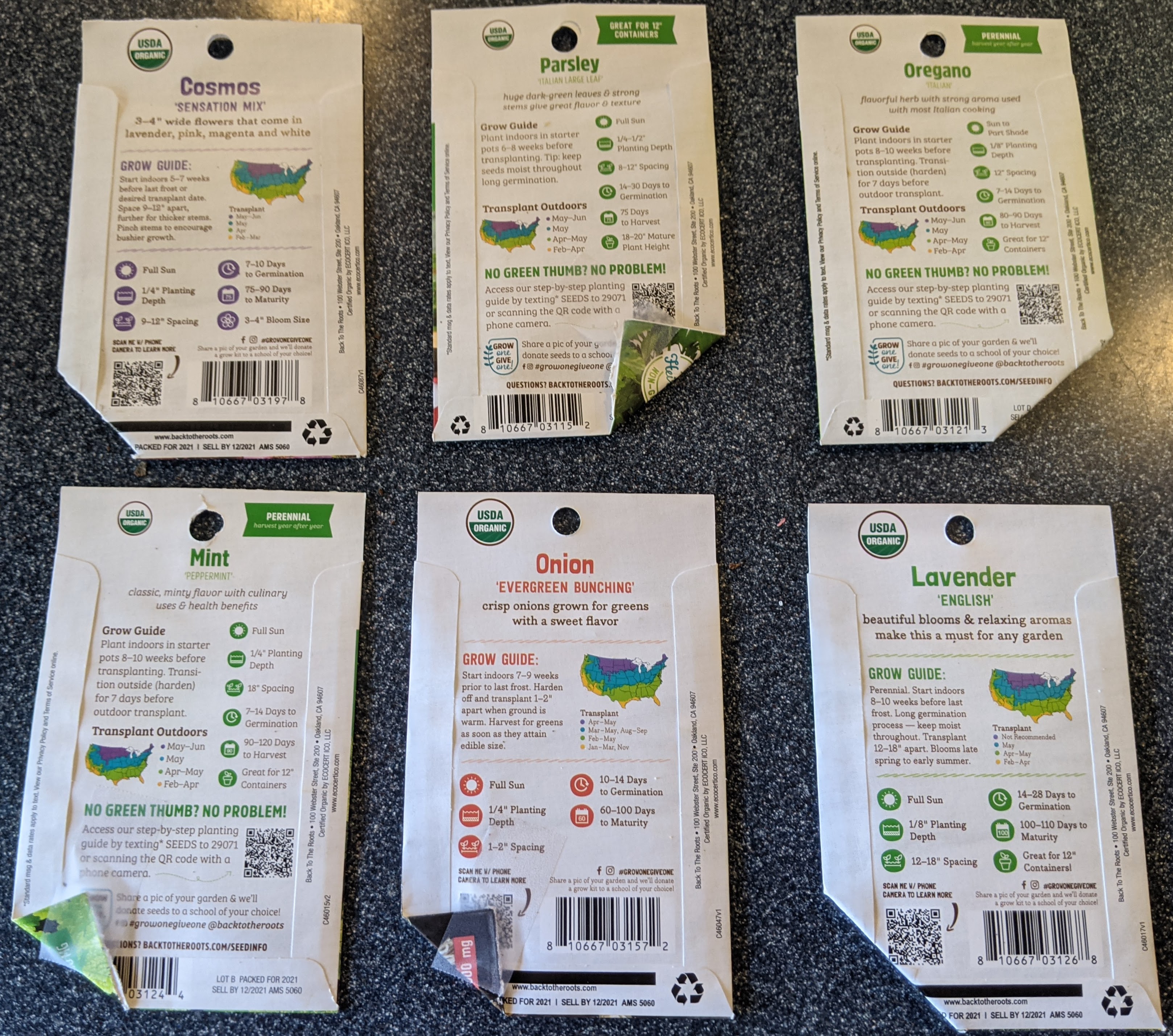 I’m so frigging excited! I ordered my Back to the Roots Organic Garden Essentials Vegetable Seeds Variety, and Organic Flowers Seeds Variety on Christmas eve, and they’re finally here! 7 weeks from our last frost date in Livermore! I’m seeding everything out that wants up to 10 weeks before transplanting, so here’s the list: