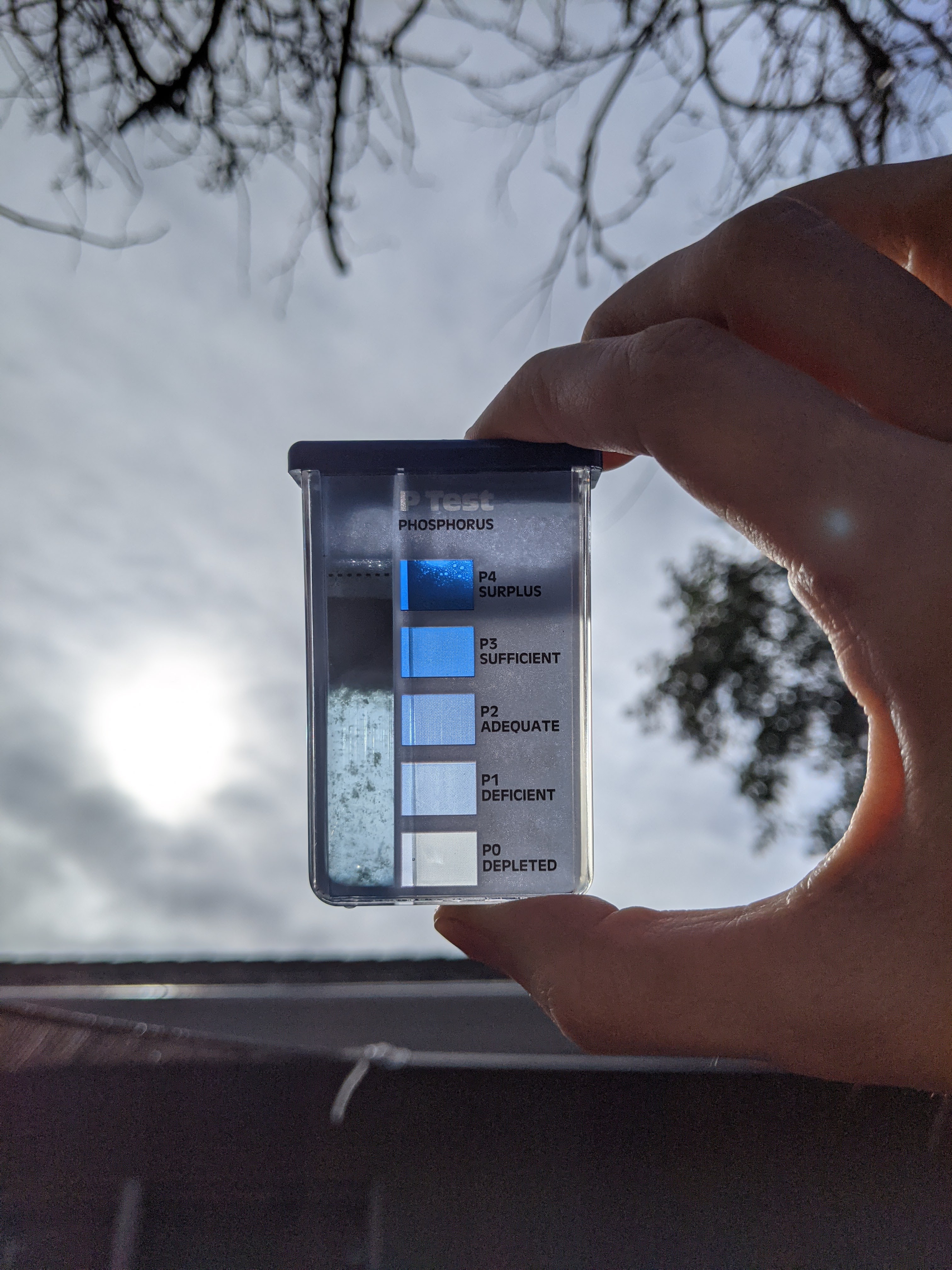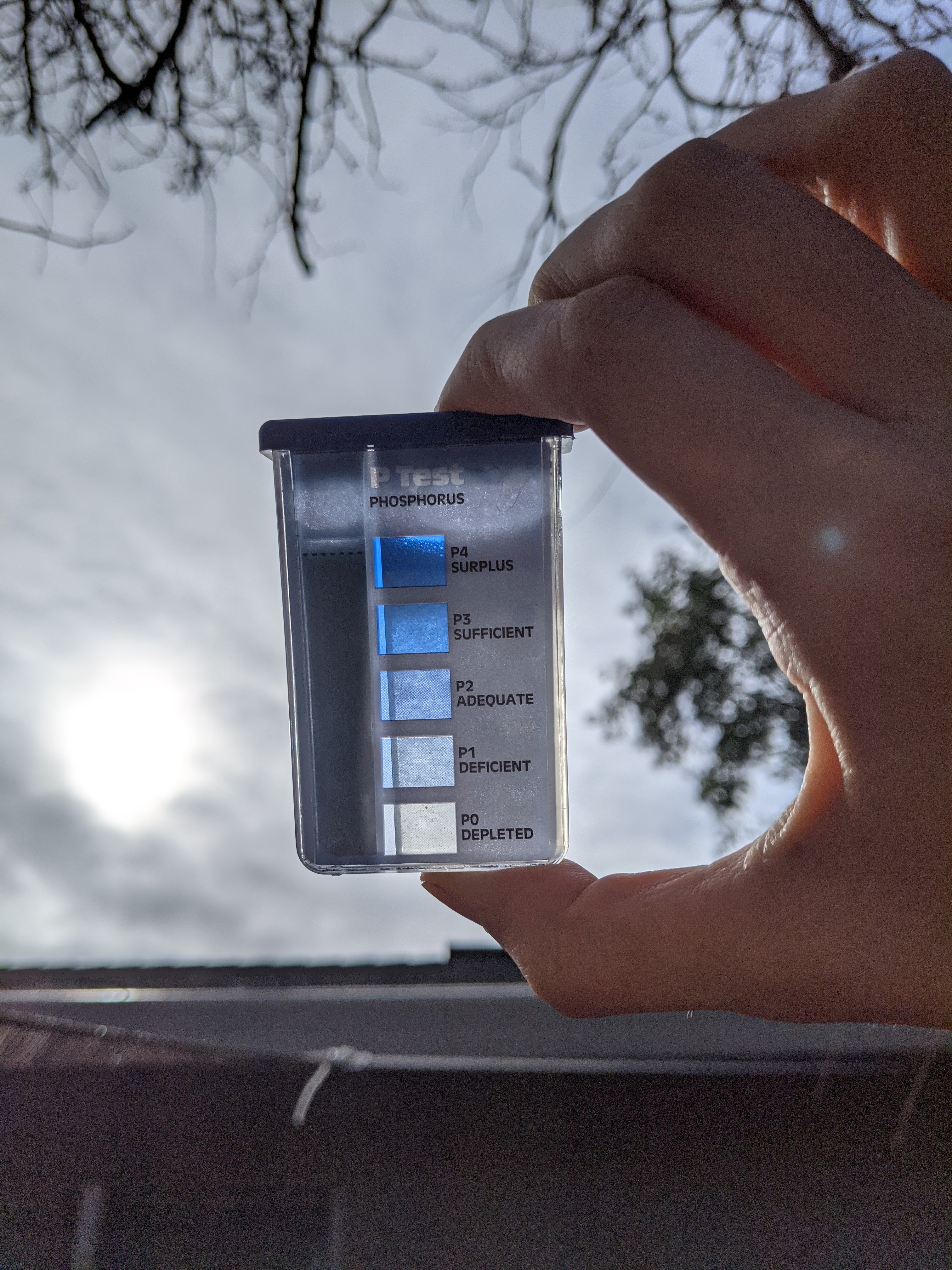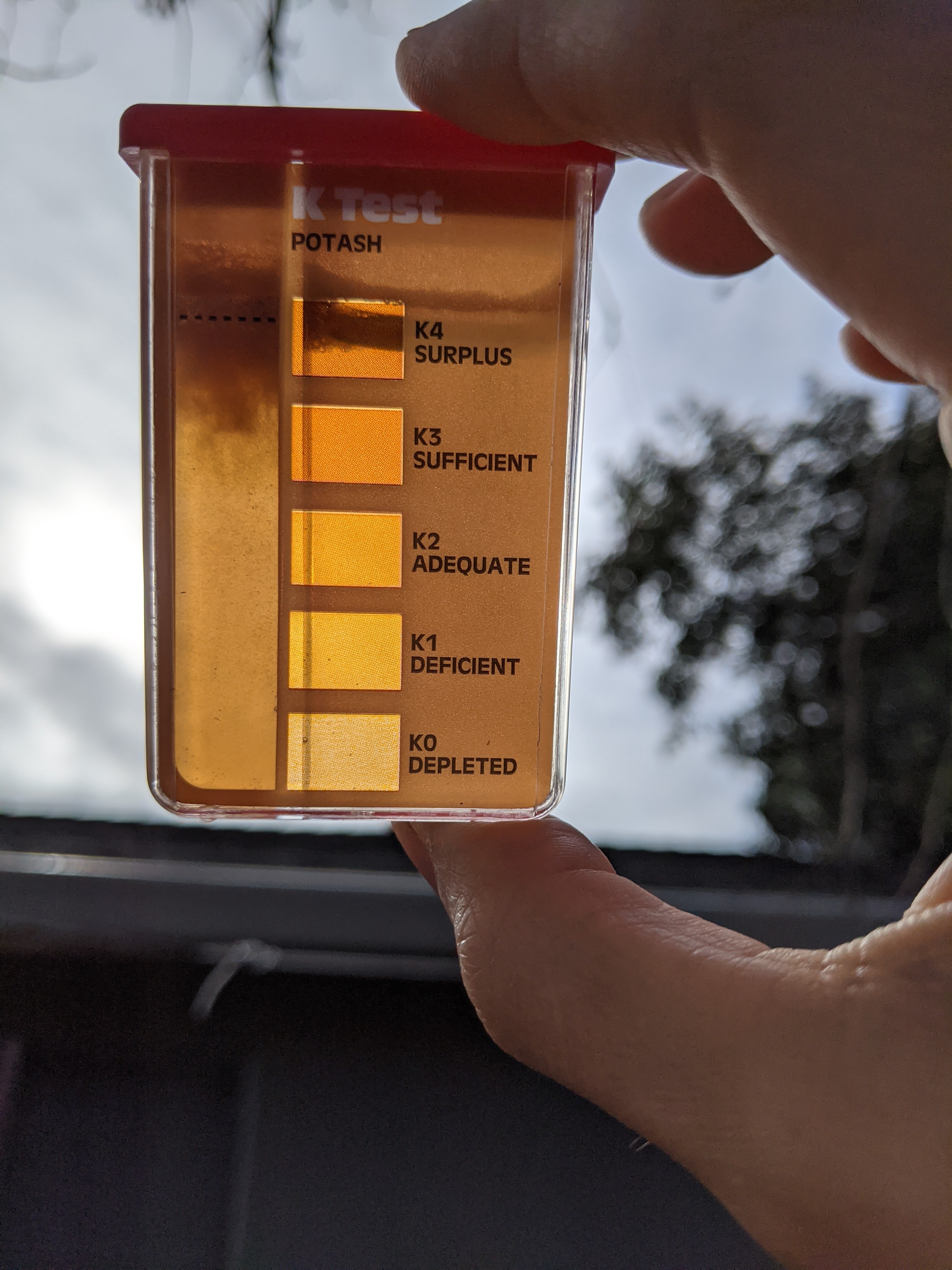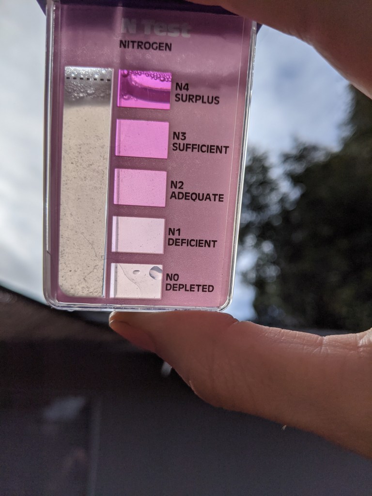 Well that was unexpected. I’d say the Rapitest worked reasonably to test the pH and nitrogen (N) content of wheat meal. The phosphorus (P) and potash or potassium (K) tests look completely different depending on whether the container has been shaken recently, or has time to settle. the Nitrogen is deficient and the phosphorus and potash are either deficient or sufficient. But even if they’re sufficient, this test kit is for soil, not for soil additives. To use these seeds as a fertilizer, the nutrient level should be through the roof because it’ll be mixed in small amounts into the soil.