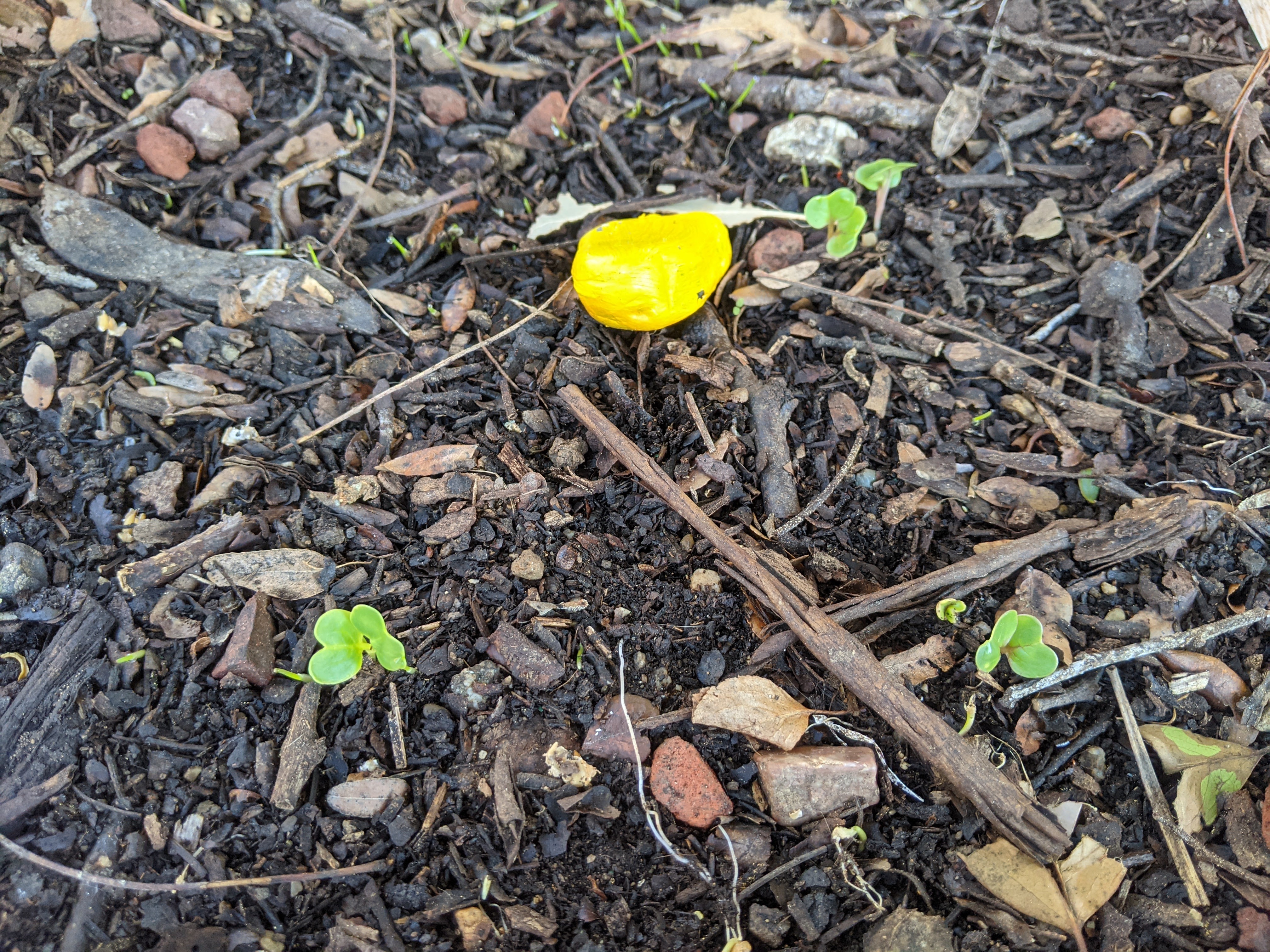 There’s a big five degree difference in temperature between the two spots. Apparently that’s plenty to prevent both the radishes and the wheat from germinating. But does it take that much? I also measured the soil temperature from a square that was a little slower to sprout. It’s between the sunny and shady squares, with about four feet between them, in a part-sun area.