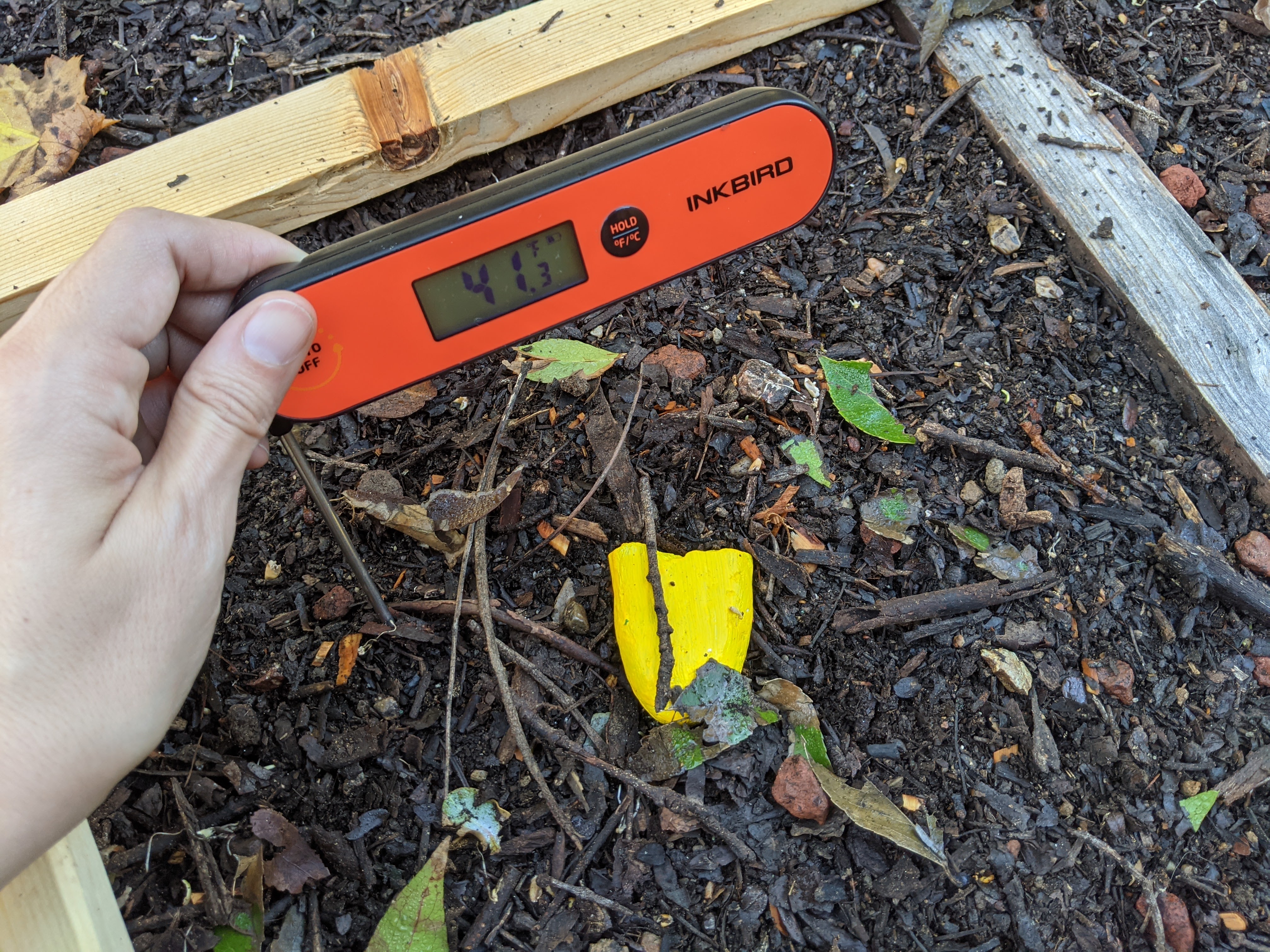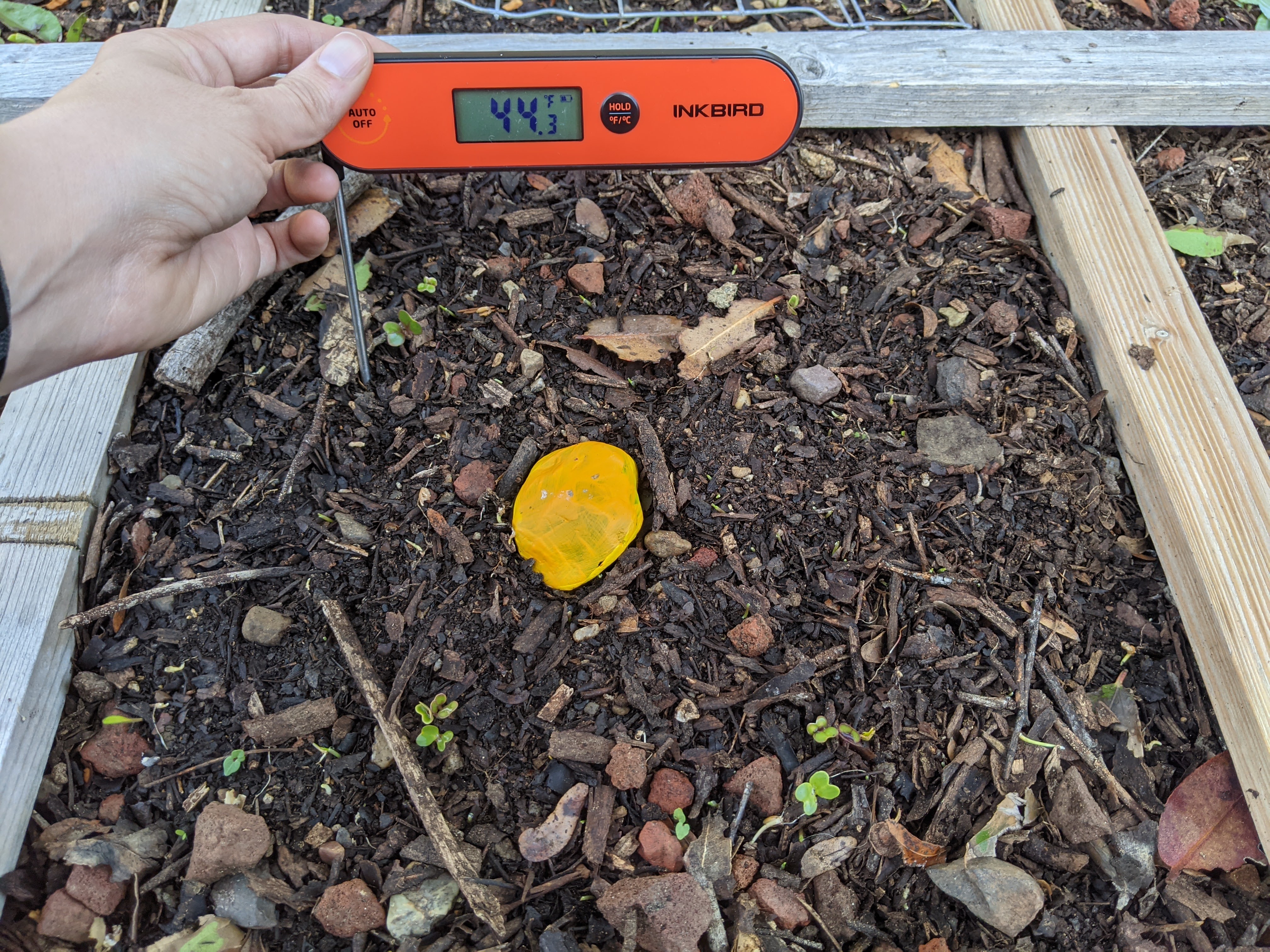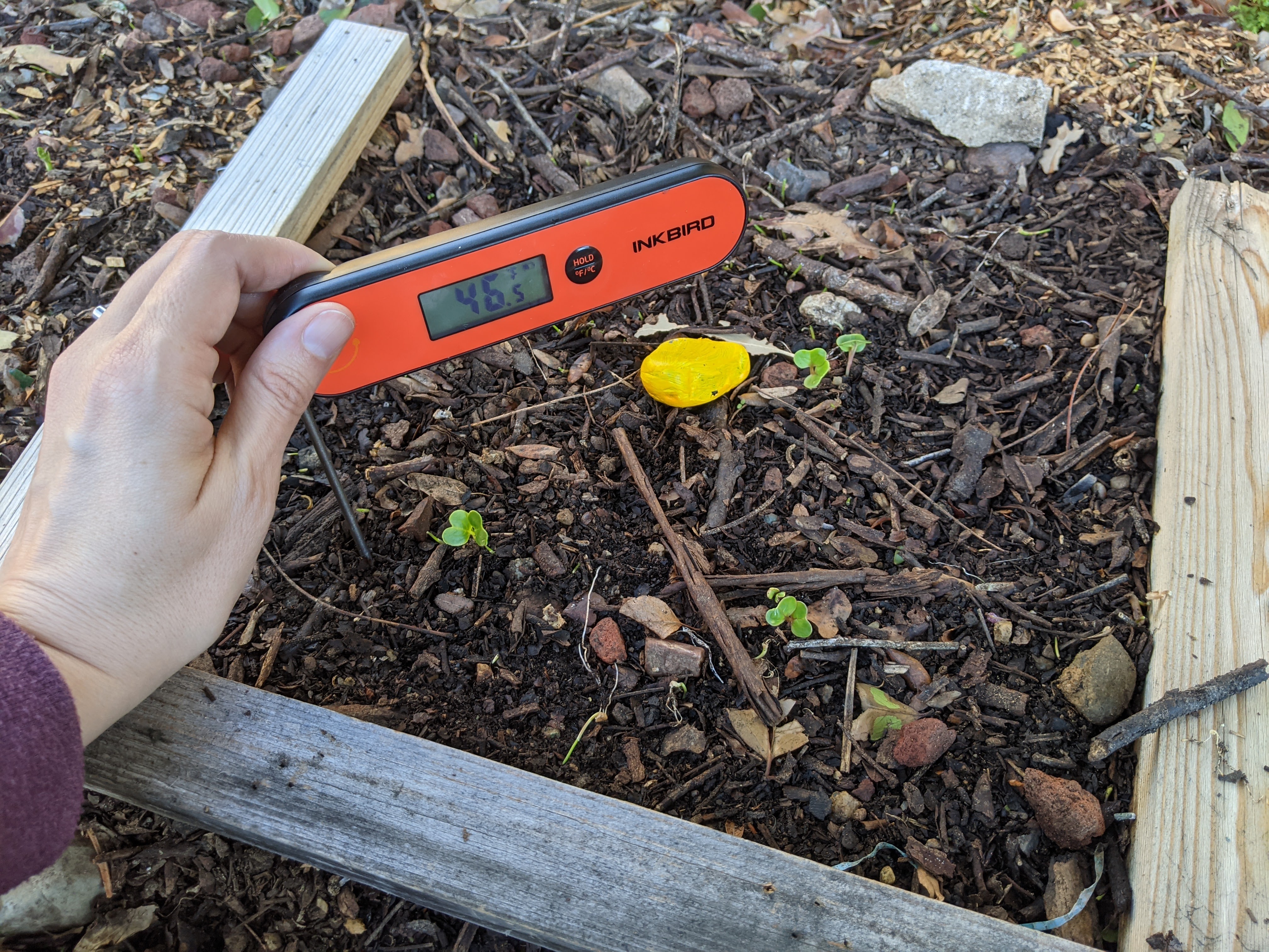 Okay, there can be days between germination and when the leaves pop up over the soil, so I can’t conclusively read this as “daikon germinate at x temperature” because I don’t know if the shady square daikon have germinated and I didn’t test the soil temperature until today.